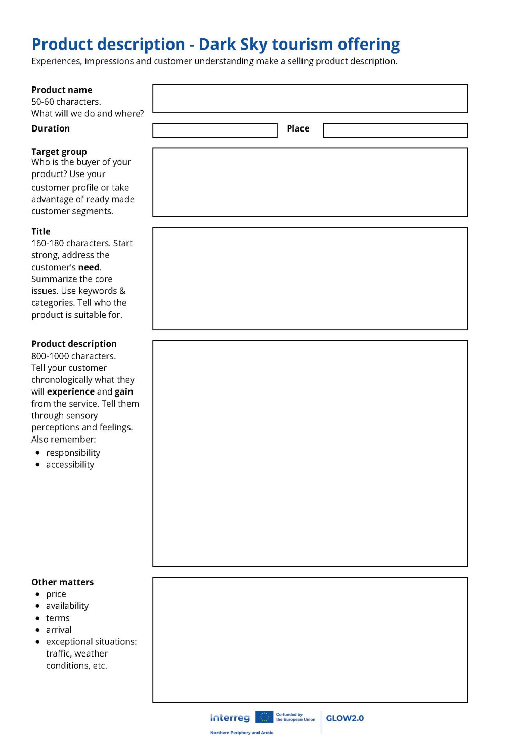 Is your product available year-round or only at certain times? What is the price, and what does it include? Are there any conditions or exceptions related to accessibility (e.g., seasonal road conditions, transport timetables) or other deviations? Record all details essential for customer convenience and/or the seller’s success here.